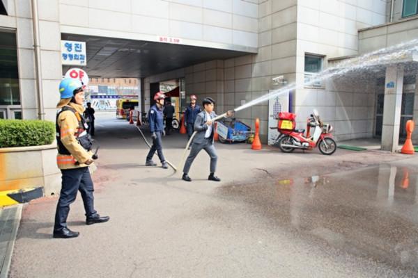 은평소방서가 최근 국민은행 응암지점에서 국민 참여 다중이용시설 화재대피 합동 훈련을 실시했다. 사진은 소방호스로 화재 진압 체험을 해보고 있는 한 시민의 모습. (사진제공=은평소방서)