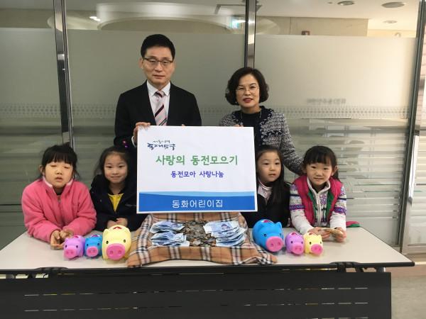 서울 동대문구 동화어린이집(동대문구 휘경2동 소재) 원생들이 최근 휘경2동 주민센터를 방문해 그동안 모은 동전을 사회복지협의회에 기탁했다. 사진은 기탁 후 기념촬영을 하고 있는 관계자들과 아이들의 모습. (사진제공=동대문구청)