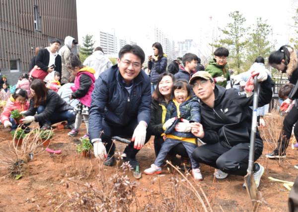 서울 노원구는 최근 불암산 힐링타운에서 ‘제74회 식목일 기념 나무심기’ 행사를 개최했다. 이날 지역주민, 마을정원사, 공무원 등 400여명이 참석해 산철쭉 8000주를 심었다. 사진은 오승록 구청장(왼쪽)과 참여 가족이 기념촬영을 하는 모습. (사진제공=노원구청)