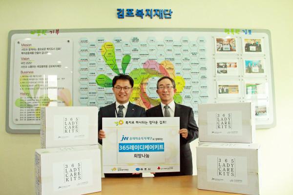 경기 김포복지재단은 최근 고촌읍 사무처에서 중외학술복지재단과 함께 김포시의 어려운 소녀들의 건강한 성장을 돕기 위한 보건위생물품 전달식을 가졌다. 사진은 관계자들이 기념촬영을 하는 모습. (사진제공=김포복지재단)