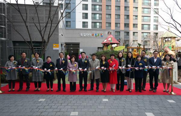 경기 부천시는 최근 42번째 국공립어린이집인 ‘옥길자이어린이집’ 개원식을 개최했다. 개원식은 학부모 등 80여명이 참석한 가운데 기념사, 테이프커팅 등으로 진행됐다. 사진은 장 시장(왼쪽 일곱번째)과 참석자들이 테이프커팅을 하는 모습. (사진제공=부천시청)