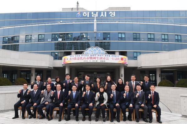 최근 경기 하남시에 중국 유산시가 도시간의 우호 협력 증진 및 경제 분야 협력 논의를 위해 방문했다. 간담회는 양 도시간의 관심 사항에 대해 토의하는 방식으로 진행됐다. 사진은 김상호 시장(가운데)과 유산시 방문단이 기념촬영을 하는 모습. (사진제공=하남시청)