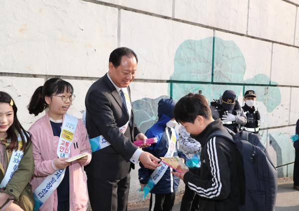 유동균 서울 마포구청장은 최근 서강초등학교 정문에서 등굣길 어린이 교통사고 예방을 위해 열린 '초등학교 교통안전 캠페인'에 참여했다. 사진은 유 구청장이 아이들에게 안전 홍보용품을 나눠주고 있는 모습. (사진제공=마포구청)