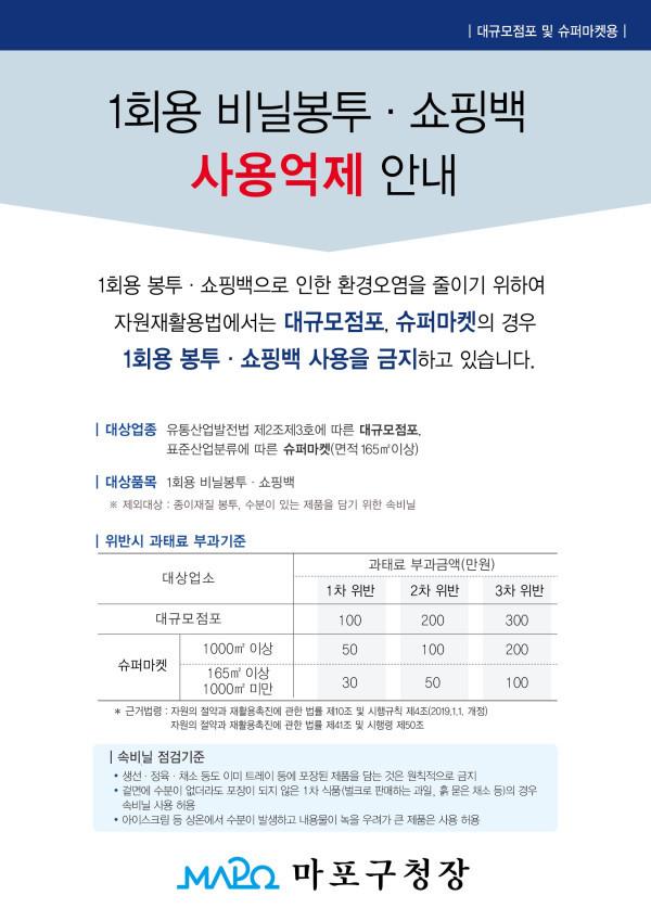 [시민일보=고수현 기자] 서울 마포구(구청장 유동균)내 대규모 점포 및 면적 165㎡ 이상 슈퍼마켓, 제과점에서 1회용 비닐봉투 사용이 제한된다.