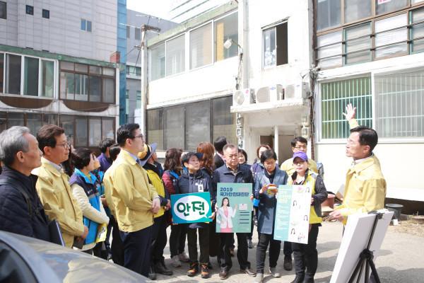 최근 이정훈 강동구청장이 국가안전대진단의 성공적 추진을 위해 지역내 재난위험시설(민간 다세대주택, D등급)을 대상으로 현장점검을 실시했다. 사진은 점검지역을 방문한 이 구청장, 공무원, 민간전문가, 주민들이 시설 관계자로부터 시설물에 대한 설명을 듣고 있는 모습. (사진제공=강동구청)