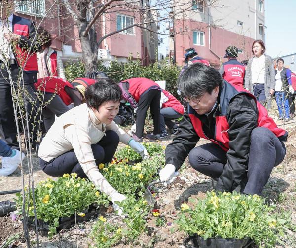 인천 서구는 최근 쓰레기가 무단투기 되고 있는 공촌천을 대상으로 깨끗한 하천 및 건강한 마을 조성을 위해 봄 초화 식재작업을 전개했다. 이날 10개 자원봉사단체 총 110명의 자원봉사자가 참여했다. 사진은 초화를 심고 있는 모습. (사진제공=인천서구청)