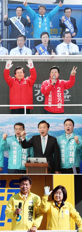 더불어민주당 이해찬 대표(오른쪽)와 홍영표 원내대표(왼쪽)가 2일 오후 경남 통영시 중앙동에서 4.3 보궐선거에 출마한 양문석 후보(가운데)에 대한 지지를 호소하고 있다. 자유한국당 황교안 대표(왼쪽)가 2일 오후 경남 창원 성산구 상남동 원이대로 일대에서 4.3 국회의원 보궐선거 자유한국당 창원성산 강기윤 후보와 함께 지지를 호소하고 있다. 바른미래당 손학규 대표(가운데)가 2일 오후 경남 창원시청에서 열린 4.3 국회의원 보궐선거 바른미래당 창원성산 이재환 후보(오른쪽) 지지 호소 기자회견에서 파이팅을 외치고 있다. 왼쪽부터 임재훈 상임선대본부장, 손 대표, 이 후보. 심상정 의원(오른쪽)이 2일 오후 경남 창원 성산구 가음정시장 입구에서 4.3 국회의원 보궐선거 더불어민주당·정의당 창원성산 여영국 단일후보(가운데) 지지를 호소하고 있다. /연합뉴스