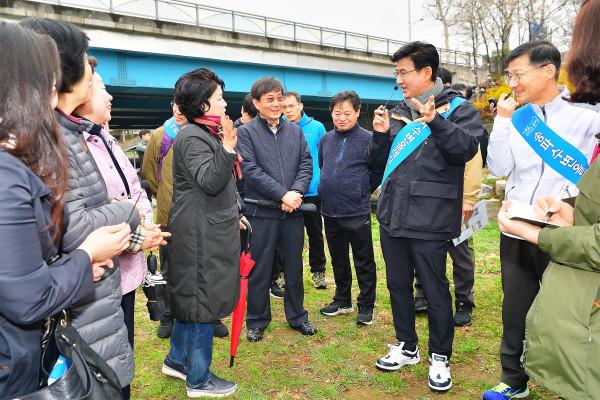 최근 박성수 송파구청장이 성내천과 장지천, 탄천, 한강을 하나로 잇는 21.2km 코스의 순환형 송파수변올레길에서 '송파 수변올레길 현장회의'를 개최했다. 사진은 박 구청장이 현장회의에 참여한 주민들과 이야기를 나누고 있는 모습.(사진제공=송파구청)