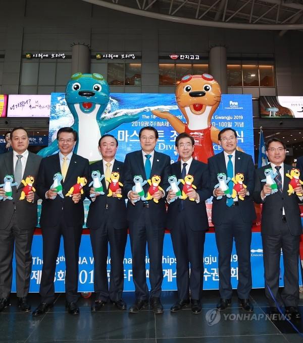 2019 광주세계수영선수권대회 D-100일을 앞두고 2일 오후 서울 KTX 용산역 3층 대합실에서 열린 대회 마스코트 조형물 제막식에서 참석자들이 대회 마스코트 인형과 함께 조형물 앞에서 기념촬영을 하고 있다. 왼쪽부터 김지용 대한수영연맹 회장, 성장현 전국 시장·군수·구청장협의회장, 민주평화당 장병완 원내대표, 이용섭 광주광역시장, 박원순 서울시장, 김동찬 광주광역시의회 의장, 권오봉 여수시장 등 참석자들이 대회 마스코트 '수리와 달이' 조형물 앞에서 마스코트 인형을 들고 기념촬영을 하고 있다.