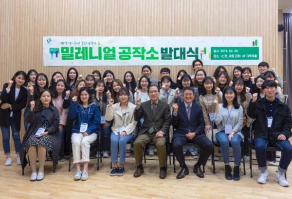 서울 서대문구 ‘신촌, 파랑고래’와 창천문화공원 일대에서 최근 2030세대의 문화행사를 기획할 ‘밀레니얼공작소’가 발대식을 갖고 출범했다. 사진은 발대식 후 기념촬영을 하고 있는 기획단의 모습. (사진제공=서대문구청)