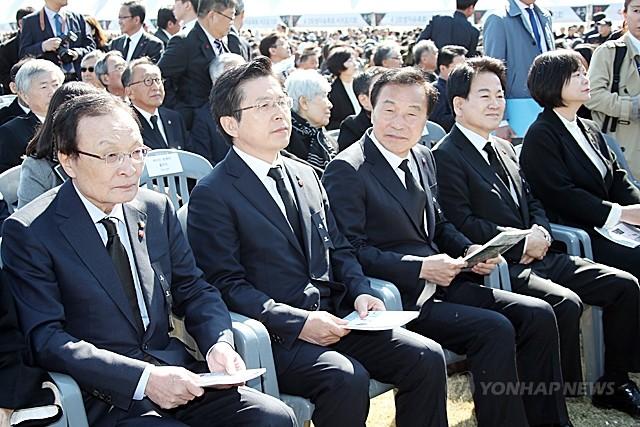 3일 오전 10시 제주 4.3평화공원에서 4.3평화재단관계자와 유족 등이 참석해 열린 제71주년 제주 4.3 희생자 추념식에 각 정당 대표들이 참석해 있다. 왼쪽부터 더불어민주당 이해찬 대표, 자유한국당 황교안 대표, 바른미래당 손학규 대표, 민주평화당 정동영 대표, 정의당 이정미 대표.