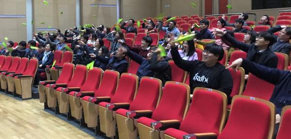 경기 안산시 상록구는 3일 상록시민홀에서 직원 100여명이 참석한 가운데 청렴교육을 실시했다. 이날 청탁금지법 및 9대 생활적폐 등의 교육과 청렴소망 종이비행기 날리기 등이 진행됐다. 사진은 직원들이 종이비행기를 날리는 모습. (사진제공=안산시청)