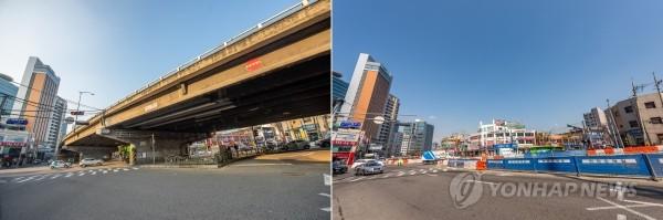 서울시가 구로고가차도를 모두 철거하고 오는 7일 0시에 전면 개통한다고 4일 밝혔다. 사진은 고가차도 철거 전(왼쪽)·후 모습.