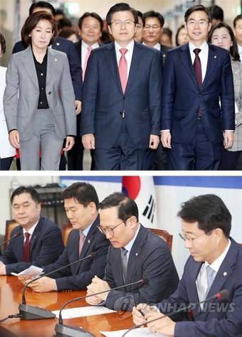 자유한국당 황교안 대표(왼쪽 세번째)가 4일 국회에서 열린 최고위원회의 회의장으로 이동하고 있다(위). 더불어민주당 홍영표 원내대표, 조정식 정책위의장 등 원내지도부가 4일 오전 국회에서 열린 정책조정회의에서 굳은 표정으로 참석하고 있다.