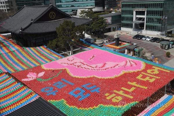 4일 서울 종로구 조계사에 '우리 모두 하나되어' 문구가 새겨진 연등이 걸려 있다. 조계사는 오는 8일 경내에서 점등식을 실시할 예정이다.
