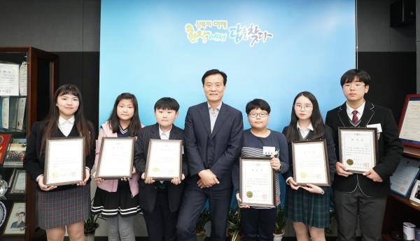 서울 성북구는 최근 구청에서 아동·청소년의 적극적 참여권 보장을 위해 ‘2019년 어린이·청소년 참여기구 합동 발대식’을 개최했다. 사진은 이날 발대식 후 이승로 구청장(가운데)과 위촉된 어린이·청소년 의원들이 기념촬영을 하는 모습. (사진제공=성북구청)