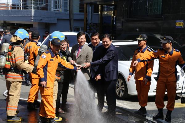 서울 영등포소방서는 최근 대림동 우리시장 주변에서 지역주민과 구의원 등 80여명이 참석한 가운데 화재 발생시 신속한 초기대응을 위한 비상소화장치 사용법을 교육하고 함께 훈련했다. 사진은 주민들이 소방대원과 함께 방수 시연을 해보는 모습. (사진제공=영등포소방서)