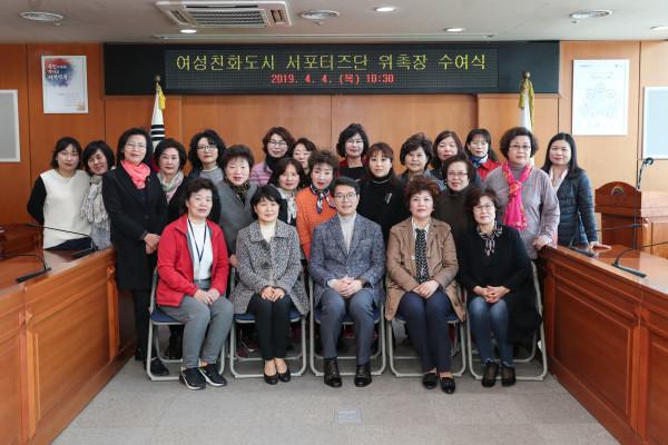 성동구가 최근 여성 불편사항을 점검하고 개선사항을 제안하는 ‘여성친화도시 서포터즈’ 위촉식을 개최했다. 이날 위촉된 서포터즈는 총 29명이다. 사진은 이날 위촉식에서 정원오 구청장(앞줄 가운데)과 서포터즈들이 기념촬영을 하는 모습. (사진제공=성동구청)