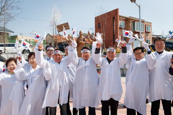 오세현 충남 아산시장은 4일 오전 온양문화원 주관으로 열린 선장면 소재 기미독립무인멸왜운동 기념탑 추모제 및 4.4만세운동기념공원 동상 제막 행사에 참석했다. 사진은 동상 제막식에 참여한 오 시장이 내빈들과 함께 만세삼창을 하는 모습. (사진제공=아산시청)