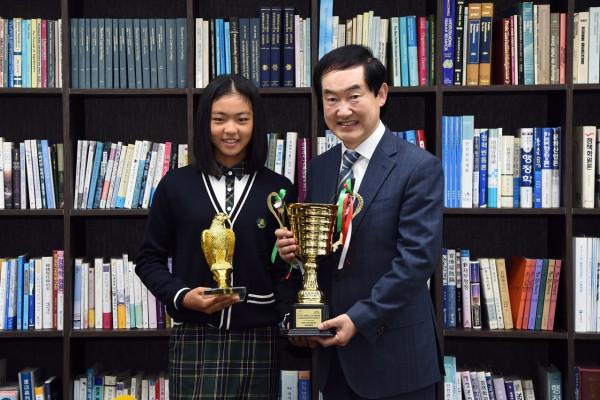 안병용 경기 의정부시장은 최근 시청에서 ‘제1회 아시아테니스연맹(ATF) 두바이챔피언십’ 대회에서 우승한 장지오 선수를 만나 더욱 훌륭한 선수로 성장해달라고 격려했다. 사진은 장 선수와 안 시장(오른쪽)이 기념촬영을 하는 모습. (사진제공=의정부시청)