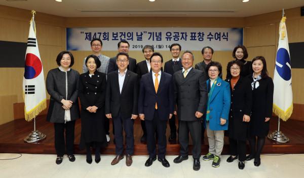 서울 강남구는 8일 오후 2시 구청 3층 큰 회의실에서 ‘제47회 보건의 날 기념 유공자 표창 수여식’을 개최했다. 사진은 정순균 구청장(앞줄 왼쪽 네번째)과 관계자들이 유공자에게 표창장 수여 후 기념촬영을 하고 있는 모습. (사진제공=강남구청)