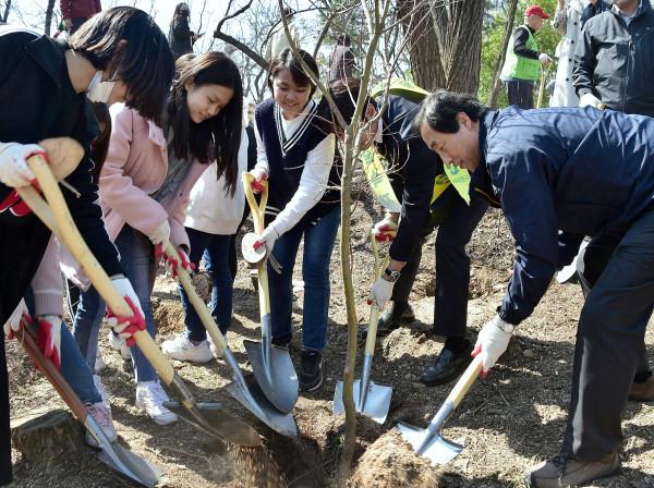 서울 서대문구가 최근 식목일을 기념해 홍은동 북한산 자락 6000㎡ 면적에 소나무, 청단풍, 진달래 등 나무 800여그루를 심었다. 사진은 이날 식목행사에 참여한 문석진 구청장(오른쪽)과 홍제초등학교 어린이들이 함께 나무를 심고 있는 모습. (사진제공=서대문구청)