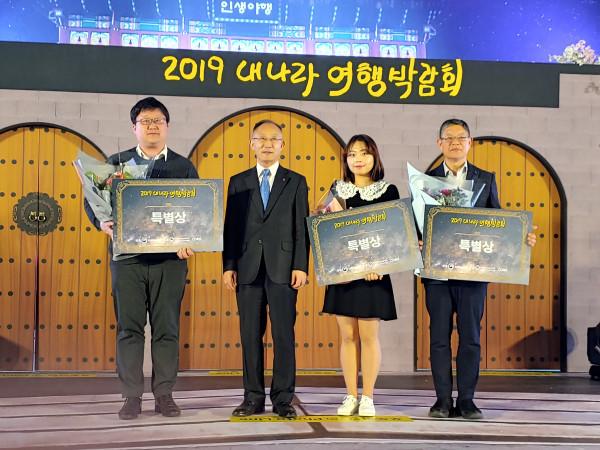 경기 안산시는 최근 문화체육관광부가 주최해 국내·외 관광 유관기관, 지자체 등 300여개 단체가 참석한 가운데 열린 국내 최대 규모의 관광 엑스포 ‘2019 내나라 여행 박람회’에서 특별상을 수상했다. 사진은 기념촬영을 하는 모습. (사진제공=안산시청)