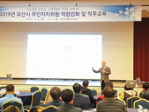 경기 오산시는 8~9일 1박2일로 전북 부안군 변산대명리조트에서 '2019년 오산시 주민자치위원 역량강화를 위한 직무교육'을 실시했다. 이번 교육에는 시 6개동 주민자치위원과 담당 공무원 등 150여명이 참석했다. 사진은 곽상욱 시장이 강의를 진행하는 모습. 사진제공=오산시청)