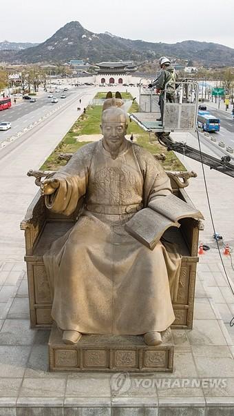 9일 오전 서울 광화문광장에서 세척 작업자들이 저압 세척기를 활용해 세종대왕상의 묵은 때를 벗겨내고 있다. 내년부터 시작되는 새 광화문광장 조성공사에 따라 동상 이전 계획이 검토 중이라 현 위치에서의 세척 작업은 올해가 마지막이 될 수도 있다.