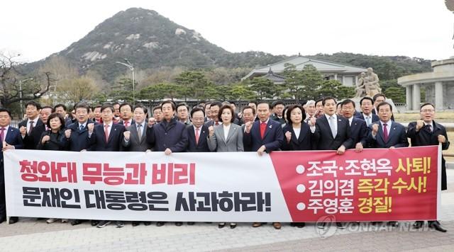 자유한국당 나경원 원내대표를 비롯한 자유한국당 의원들이 9일 오전 청와대 앞에서 열린 긴급 비상의원총회에서 구호를 외치고 있다.