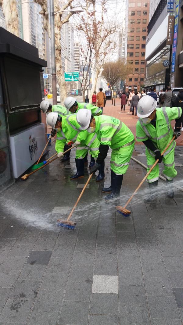 | ▲ 구청 관계자들이 도로 물청소를 실시하고 있다. (사진제공=강남구청) | ||