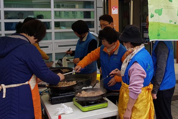 서울 노원구 공릉1동 주민센터는 최근 동주민센터 2층 주민사랑방에서 ‘사랑 나눔 일일밥집’을 운영했다. 이날 자원봉사자 30명이 비빔밥과 불고기 등의 음식을 직접 조리해 노인 200명에게 대접했다. 사진은 음식을 조리하는 모습. (사진제공=노원구청)