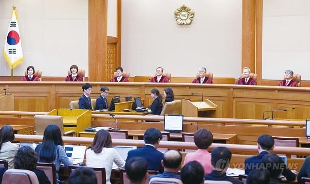 유남석 헌법재판소장 등 헌법재판관들이 11일 서울 재동 헌법재판소 대심판정에 착석하고 있다. 왼쪽부터 이은애, 이선애, 서기석 헌법재판관, 유남석 헌재소장, 조용호, 이석태, 이종석 헌법재판관.