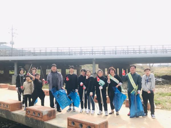 경기 포천시 군내면은 최근 기관 및 단체 합동으로 새봄맞이 포천천변 대청소를 실시했다. 이날 행사에서 포천교에서부터 한내교 약 1.2km 구간에서 쓰레기 약 500kg을 수거했다. 사진은 참가자들이 대청소에 앞서 기념촬영을 하는 모습. (사진제공=포천시청)