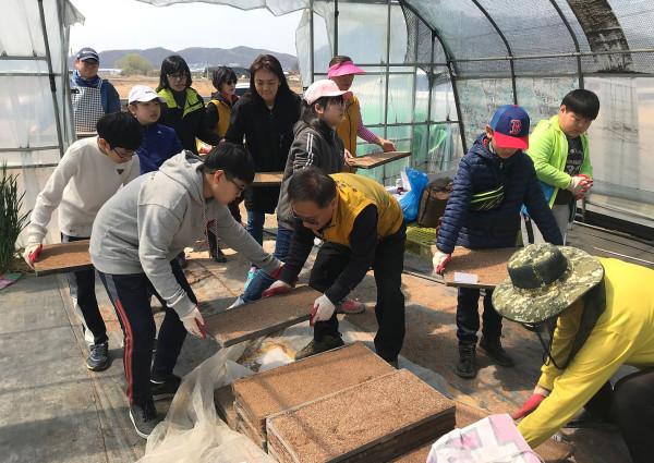 인천 서구 불로대곡동 주민자치위원회는 지난 15일 ‘2019년 제3회 황화산골 논 학교’ 행사를 개최했다. 이날 논 학교 입학식 및 첫 번째 수업으로 '1인 1모판 만들기'를 했다. 사진은 행사에 참여한 아이들과 주민들이 모판을 옮기는 모습. (사진제공=인천서구청)