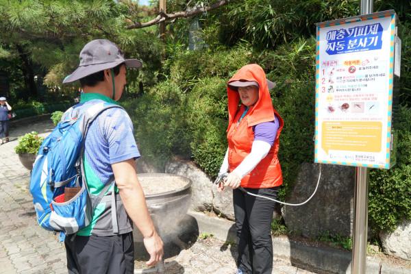 | ▲ 한 등산객이 등산 시작 전 ‘해충기피제 자동분사기’를 이용해 기피제를 몸에 뿌리고 있다. (사진제공=동대문구청) | ||