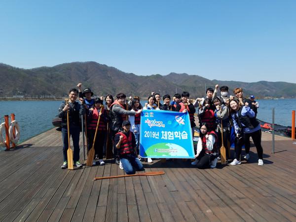 경기 구리시와 시 청소년지원센터 꿈드림은 17일 학교 밖 청소년 15명을 대상으로 강원도 춘천시 의암호 일대에서 '봄 나들이 가자' 프로그램을 진행했다. 사진은 이번 행사에 참여한 청소년들이 킹카누 체험을 하고 기념촬영을 하는 모습. (사진제공=구리시청)
