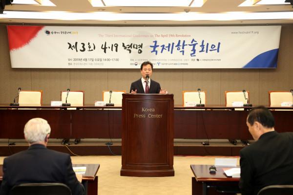 | ▲ 최근 열린 '제3회 4.19혁명 국제학술회의'에 참석한 박겸수 구청장(가운데)이 인사말을 전하고 있다. (사진제공=강북구청) | ||