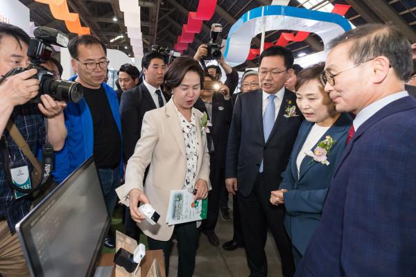 김수영 양천구청장(가운데)이 17일 오후 3시 인천시 인천항 제8부두에서 열린 ‘2019 도시재생 산업박람회’에 참석해 김현미 국토교통부장관에게 홀몸노인 고독사방지를 위한 IoT 스마트플러그에 대해 설명하고 있다. (사진제공=양천구청)