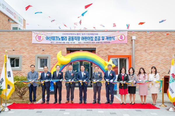 18일 충남 아산시 둔포면 아산테크노밸리 일반산업단지 중앙공원내에 아동 99명, 교직원 16명을 수용할 수 있는 999.01㎡ 규모의 공동직장어린이집 준공식 및 개원식이 개최됐다. 사진은 개원식에 참가한 참석자들이 리본커팅을 하고 있는 모습. (사진제공=아산시청)
