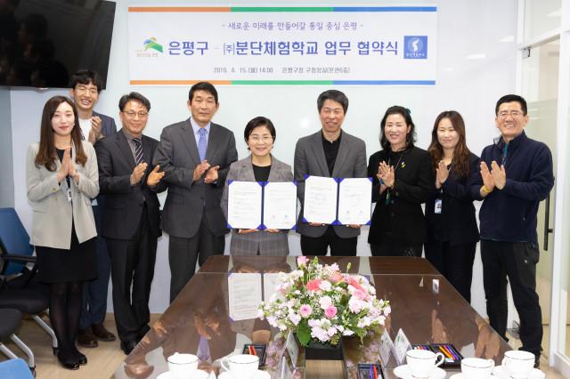 ㈜분단체험학교는 ‘통일, 평화, 체험’을 교육 이념으로 청소년, 성인 등을 대상으로 현장 방문과 강연 등을 통한 평화·통일 체험 교육 프로그램을 다년간 운영해왔다. 이번 업무협약으로 은평구는 ‘통일유적지 탐방’, ‘철조망자르기’, ‘통일리본달기’ 등 분단체험학교가 가진 양질의 평화·통일 교육 콘텐츠를 구민들에게 제공할 수 있을 것으로 기대하고 있다.