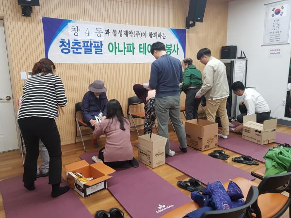서울 도봉구는 최근 창4동 주민센터에서 지역내 기업인 동성제약의 후원으로 ‘창4동 아나파데이!’ 아나파테이핑 행사를 진행했다. 이날 아나파 테이핑 봉사단은 지역내 노인 30여명의 통증 부위에 근육테이핑을 했다. 사진은 테이핑을 하는 모습. (사진제공=도봉구청)