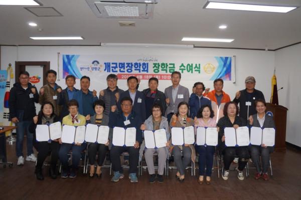 경기 양평군 개군면 장학회가 지난 18일 면사무소 2층 회의실에서 지역내 주민의 대학생 자녀 중 신입생 전원, 성적우수 재학생 등 16명에게 총 1500만원의 장학금과 장학증서를 전달했다. 사진은 장학금 수여자들과 관계자들이 기념촬영을 하는 모습. (사진제공=양평군청)