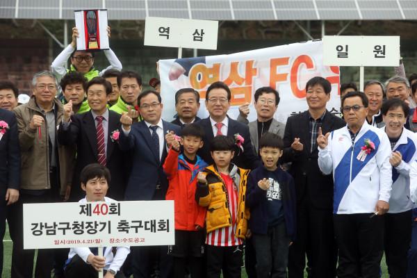 정순균 강남구청장이 21일 개포동 수도공고에서 열린 ‘제40회 강남구청장배 축구대회’에 참석했다. 사진은 대회에 참석해 참가구민들과 함께 기념촬영을 하고 있는 정 구청장의 모습. (사진제공=강남구청)