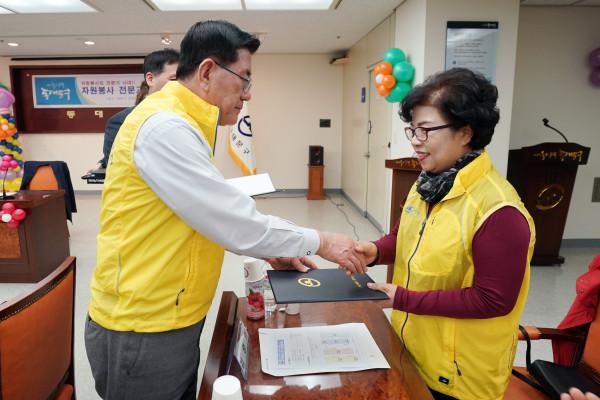 수료식에 참석한 유덕열 구청장은 수료자에게 수료증을 수여하며 “자원봉사 전문교육을 단순히 배움의 즐거움을 넘어 자원봉사의 나눔으로 승화시킨 열정을 치하한다. 새로운 도전에 성공한 수료자들이 앞으로 자원봉사로서의 활동을 활발하게 펼치기를 기대한다”고 축하와 격려의 인사를 전했다.