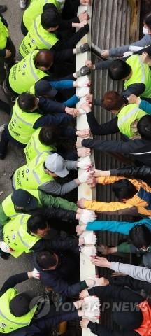25일 오전 서울 동작구 구 노량진수산시장 주차 타워에서 명도집행 관계자들이 철제 담벼락을 걷어내며 진입하려 하자 상인과 시민단체 측이 이를 막고 있다.