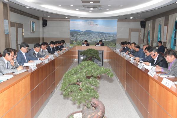 경기 동두천시는 25일 시청 상황실에서 최용덕 시장 및 부시장, 국·단장, 담당관, 해당 부서장 등 30여명이 참석해 '민선7기 공약사항 및 2019년 현안사업 추진상황 보고회'를 개최했다. 사진은 최 시장과 관계자들의 보고회 진행 모습. (사진제공=동두천시청)