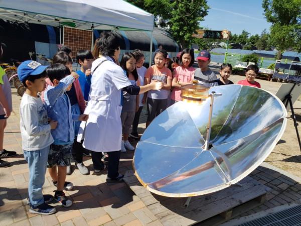| ▲ 2018 친환경에너지 체험농장을 방문한 아이들이 태양에너지를 모아 계란을 삶고 있다. (사진제공=강동구청) | ||