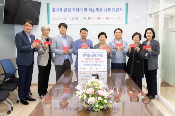 서울 은평구와 롯데몰 은평점은 최근 구청에서 롯데몰 은평 주관 ‘가정의 달 맞이 저소득층 문화공헌 지원사업’ 성품 전달식을 개최했다. 사진은 이날 전달식에 참석한 김미경 구청장(오른쪽 네번째)과 롯데몰 은평점 관계자들이 기념촬영을 하는 모습. (사진제공=은평구청)