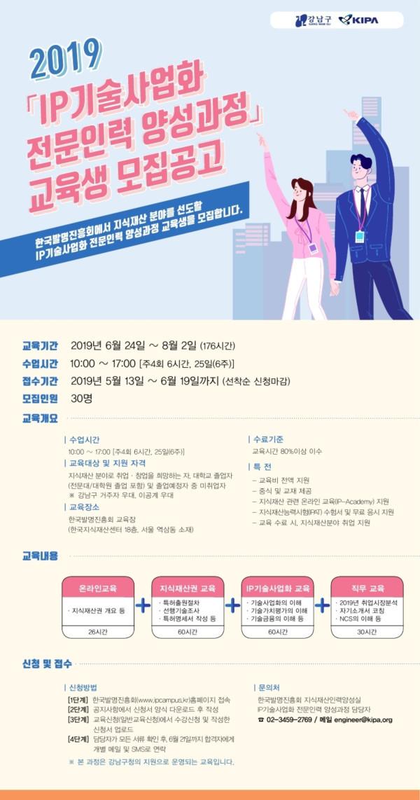 IP란 지식재산권으로 발명·상표·디자인 등 산업재산권과 문학·음악·미술작품에 관한 저작권을 총칭하는 것으로, 모집대상은 전문대 이상 졸업(예정)자 가운데 미취업자로 강남구 거주자와 이공계를 우선 선발한다.